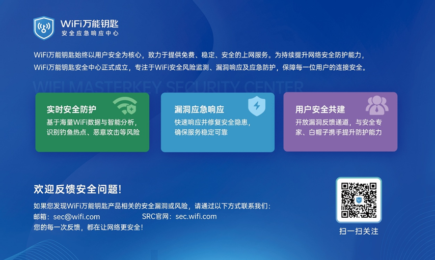 开放协同,社群共治: 秉持大会所倡导的协同与生态共建理念,WiFi安全中心将秉持开放态度,携手全球安全专家、白帽子及用户,通过开放的漏洞反馈渠道,汇聚社群智慧,共同提升整体安全防护水位,形成应对新型威胁的合力。